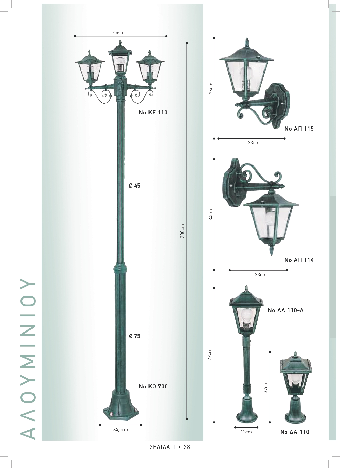 Φωτιστικά βαρέος τύπου μασίφ αλουμινίου. Η πρώτη ύλη είναι εισαγωγής διεθνούς Ιταλικού οίκου και στο εργαστήριο μας γίνεται η επεξεργασία, η απολάδωση, το φινίρισμα, το βάψιμο με ηλεκτροστατική βαφή, σε απόχρωση μαύρο ματ σαγρέ, ή αποχρώσεις πατίνας αντικέ (βλέπε χρωματολόγιο).