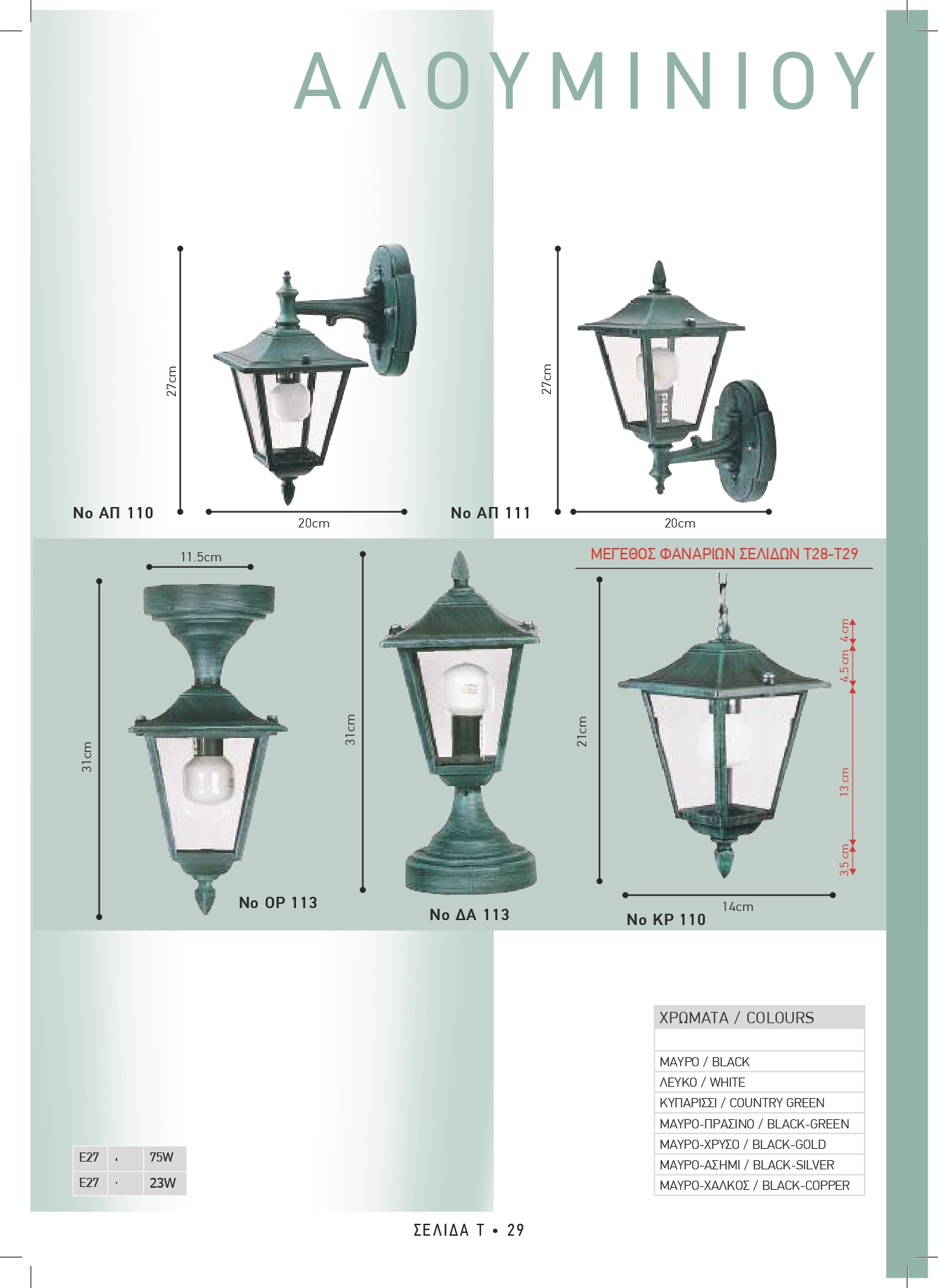 Φωτιστικά βαρέος τύπου μασίφ αλουμινίου. Η πρώτη ύλη είναι εισαγωγής διεθνούς Ιταλικού οίκου και στο εργαστήριο μας γίνεται η επεξεργασία, η απολάδωση, το φινίρισμα, το βάψιμο με ηλεκτροστατική βαφή, σε απόχρωση μαύρο ματ σαγρέ, ή αποχρώσεις πατίνας αντικέ (βλέπε χρωματολόγιο).