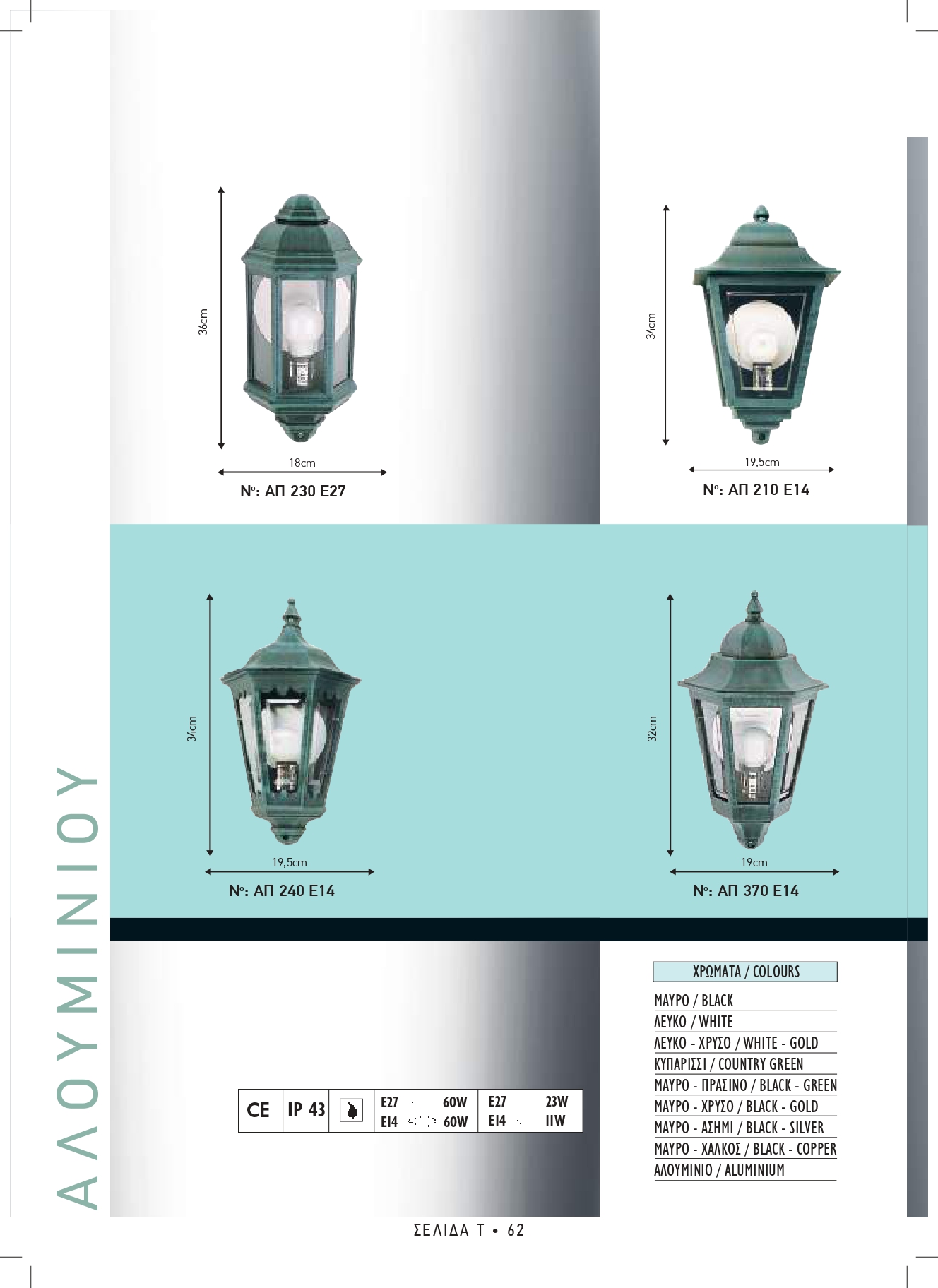 Φωτιστικά βαρέος τύπου μασίφ αλουμινίου. Η πρώτη ύλη είναι εισαγωγής διεθνούς Ιταλικού οίκου και στο εργαστήριο μας γίνεται η επεξεργασία, η απολάδωση, το φινίρισμα, το βάψιμο με ηλεκτροστατική βαφή, σε απόχρωση μαύρο ματ σαγρέ, ή αποχρώσεις πατίνας αντικέ (βλέπε χρωματολόγιο).