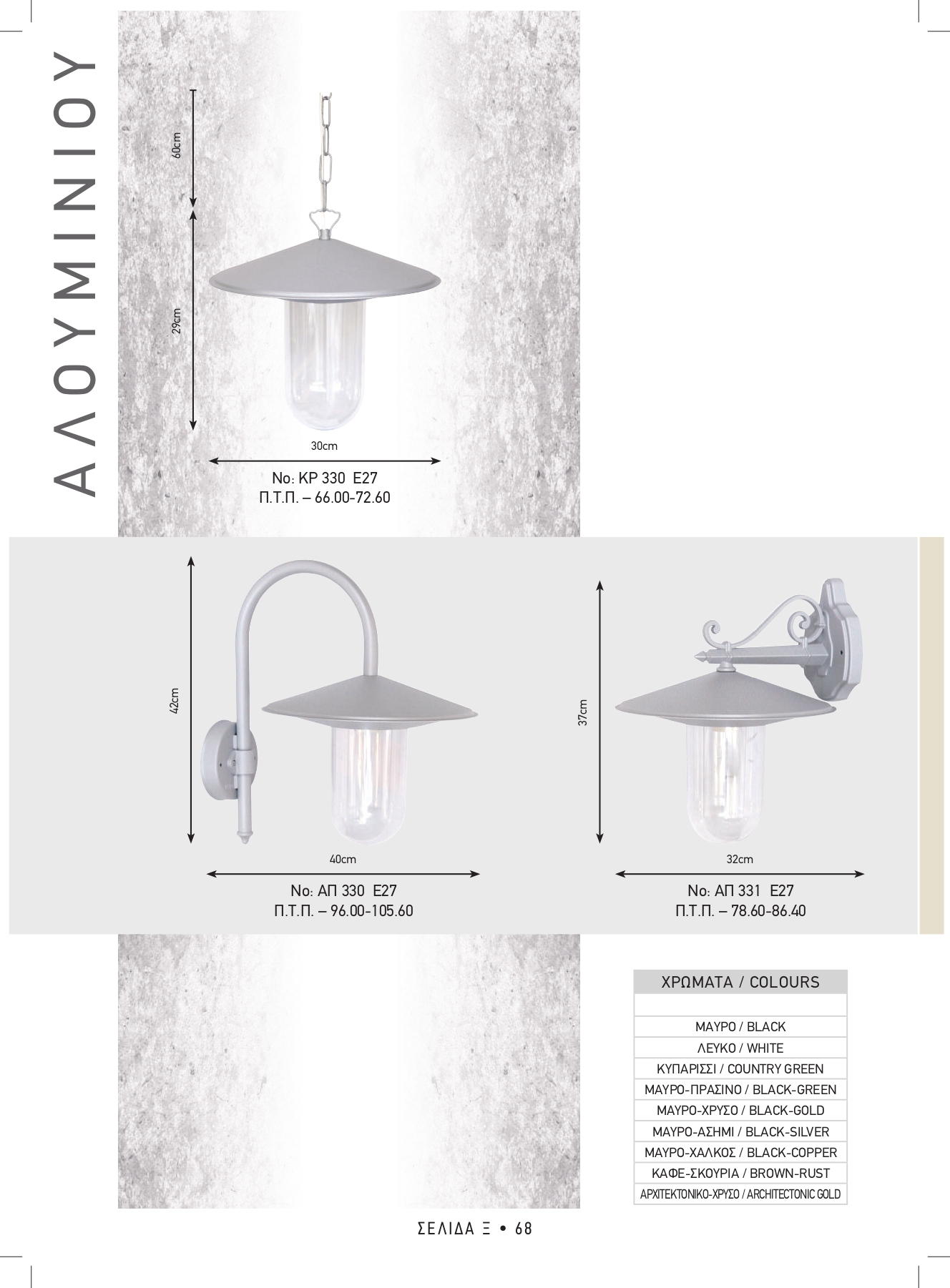 Φωτιστικά βαρέος τύπου μασίφ αλουμινίου. Η πρώτη ύλη είναι εισαγωγής διεθνούς Ιταλικού οίκου και στο εργαστήριο μας γίνεται η επεξεργασία, η απολάδωση, το φινίρισμα, το βάψιμο με ηλεκτροστατική βαφή, σε απόχρωση μαύρο ματ σαγρέ, ή αποχρώσεις πατίνας αντικέ (βλέπε χρωματολόγιο).