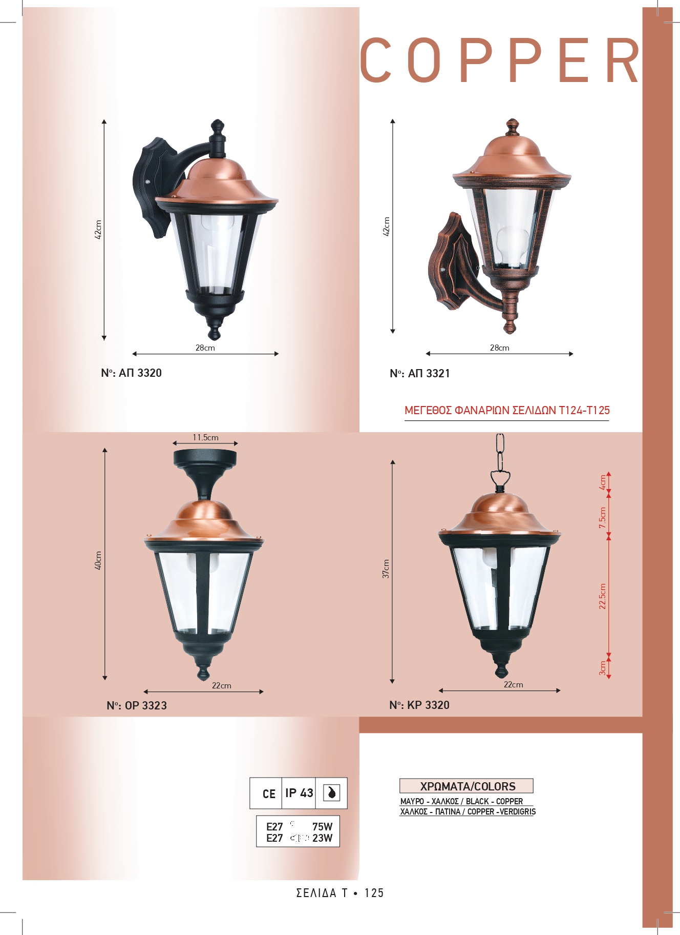 Φωτιστικά βαρέος τύπου μασίφ αλουμινίου. Η πρώτη ύλη είναι εισαγωγής διεθνούς Ιταλικού οίκου και στο εργαστήριο μας γίνεται η επεξεργασία, η απολάδωση, το φινίρισμα, το βάψιμο με ηλεκτροστατική βαφή, σε απόχρωση μαύρο ματ σαγρέ, ή αποχρώσεις πατίνας αντικέ (βλέπε χρωματολόγιο).
